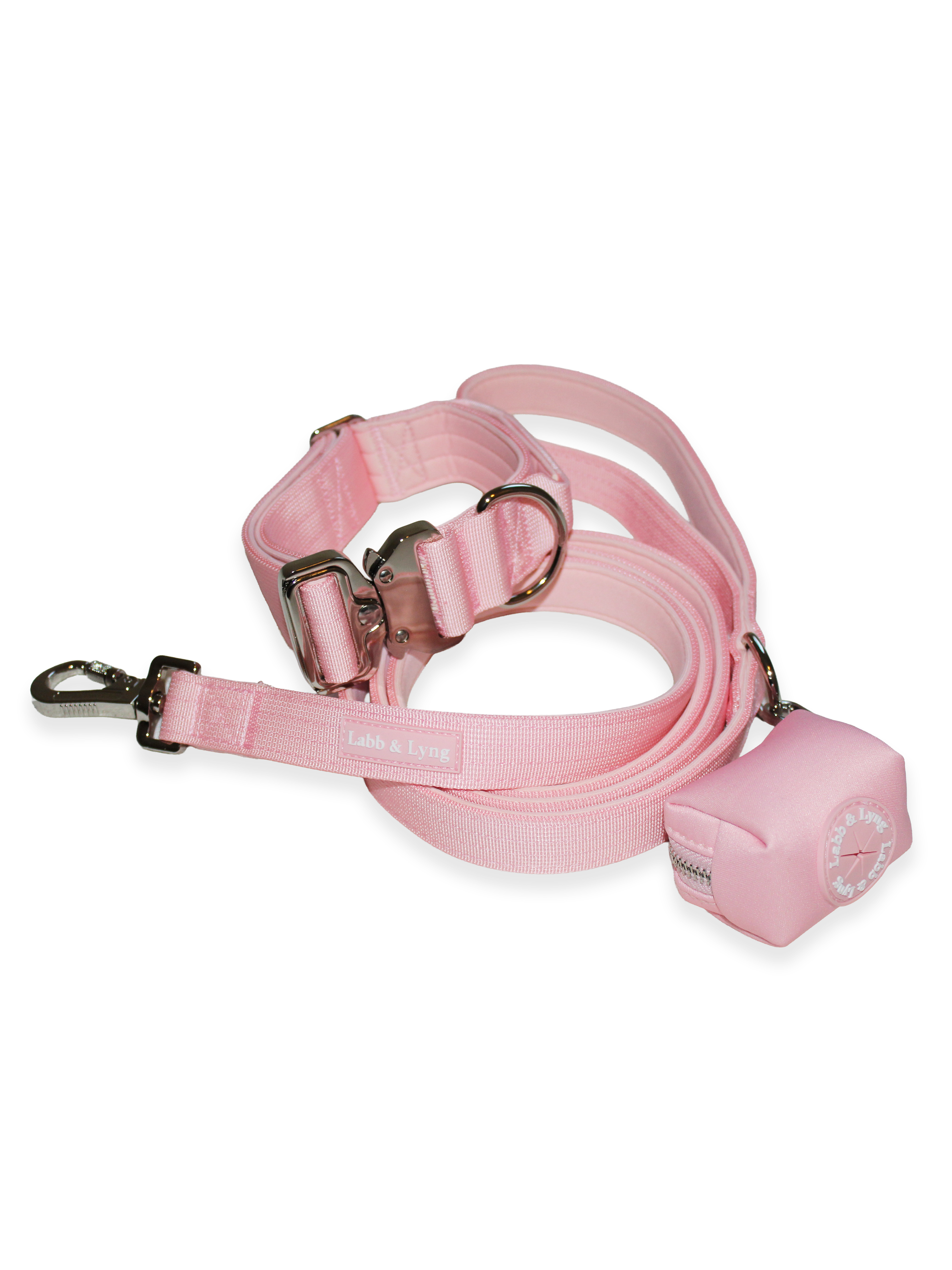 Dette settet består av et halsbånd, et bånd på 1,8 meter, og en bæsjeposeholder med pose inni.