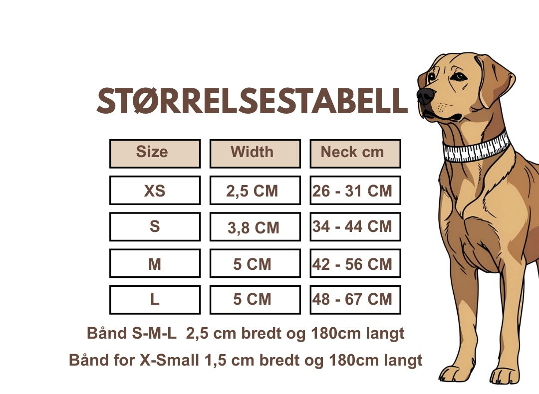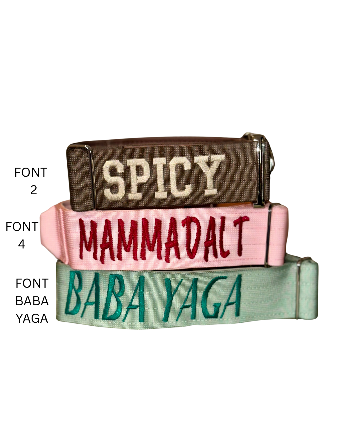 Vi broderer halsbåndene gratis, men merk at fonten på nettsiden ikke alltid er helt lik den i broderingsprogrammet vårt. Men fonten er fortsatt like fin, så ikke tvil på det!